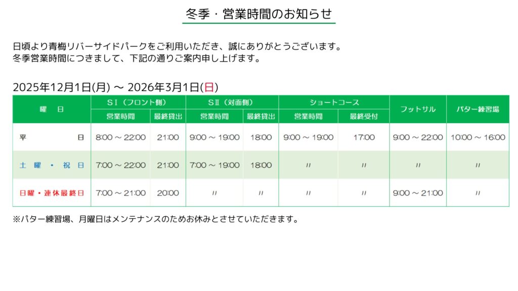 冬季・営業時間のお知らせ